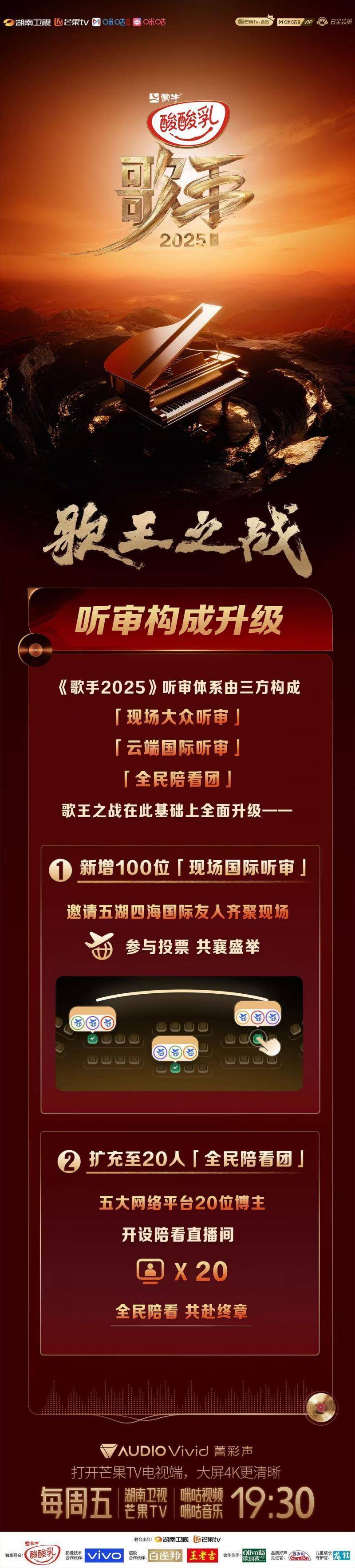 两轮收货各占半壁山河,意味着任何一轮的乌有王人可能影响全局。为此,总决赛将升级听审团成立。在原有“现场天下听审”“云表海外听审”“全民陪看团”的基础上,新增100位“现场海外听审”,他们的加入必定让审好意思法子更添多元变量。与此同期,“全民陪看团”扩张至20东说念主,五大采集平台20位博主开设陪看直播间,全民陪看共赴终章。