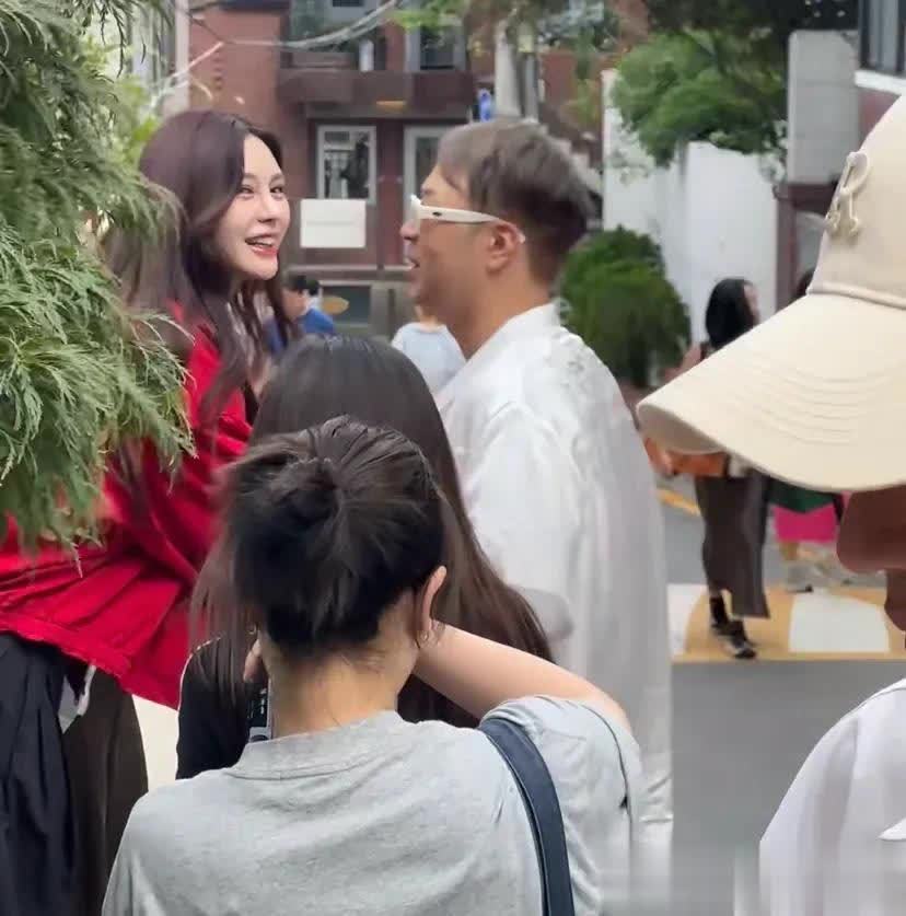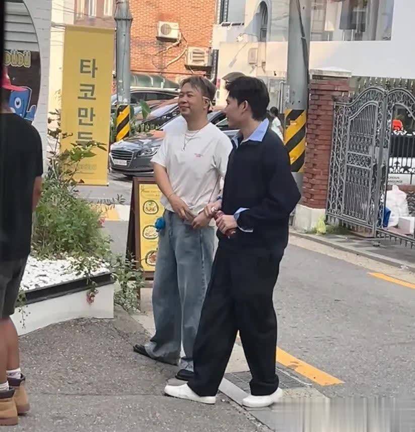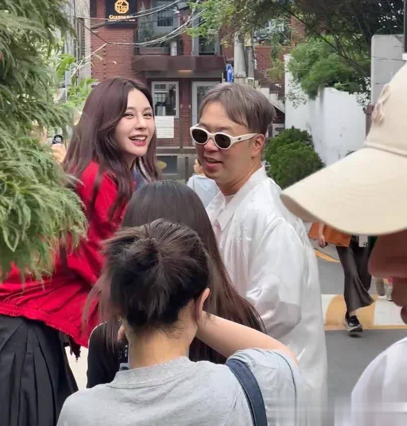 韩国天气相比热,但因为是职责需要,沈梦辰穿的相比多,一个红色的夹克外衣,搭配玄色宽松失业裤,内部还穿了长袖衬衫,关联词很好意思很飒。沈梦辰站在路边拍摄,尽头敬业。