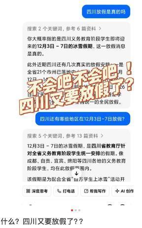 12月3日,网罗流传一张AI问答截图,截图中的AI回报网友四川休假的发问时,答说念“你好像率指的是四川义务训诫阶段学生行将迎来的12月3日-7日的冰雪假期,这一休假音信是真实。”况且还会给出一个同发扬文献雷同的说法。