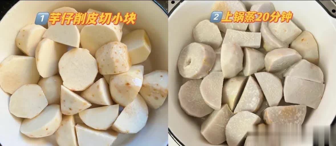 技能到,咱们把蒸锅揭开,这个时候,内部的小芋头就也曾十足被蒸软了。蒸好的小芋头不错看到碗内部有一丝点水蒸气。这个水蒸气也不要倒掉了,有一丝水蒸气后期咱们把料汁淋在上头之后,吃起来口感会更好。